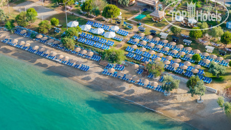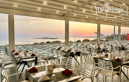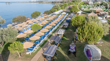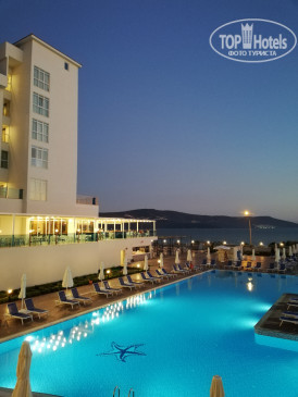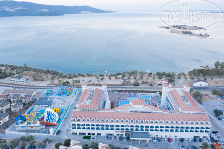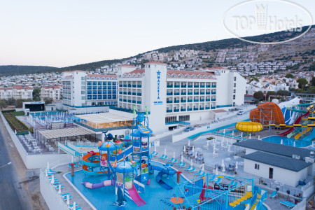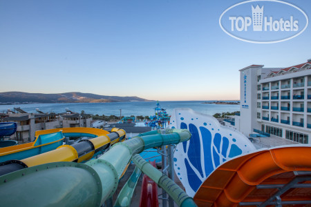 Отдыхали в середине июня. В целом если собрать все отзывы воедино, то получится как раз полная картина. Ехать до от отеля от аэропорта Бодрума около полутора часов. Отель расположен по центру бухты Акбук. Во круг на расстоянии 1-2 можно сказать ничего. Есть в шаговой доступности справа от отеля (если смотреть на море) Мигрос, слева Карефур и Бим. Можно дойти до мечети в 1 км примерно, но это путь в горку. Больше выйти некуда. Так же рядом остановка маршрутки на которой можно доехать до Дидима за 30-40 минут и 65 лир с человека. Вот в Дидиме есть чуть больше что посмотреть, есть несколько магазинов вещевых, но именно крупных торговых центров нет. Так же на окраине Дидима есть храм Апполона (в июне 2025 был закрыт на реконструкцию, поэтому мы увидели его только со стороны). Территория отеля относительно небольшая и занята в основном как раз тем что видно на фото, бассейнами, аквапарком (к нему проход по бетонному мостику), шезлонгами и тд, растительности почти никакой, проход к пляжу по подземному переходу под шоссе (не утомляет совершенно), имеется лифт для посетителей с детьми и мало мобильных посетителей. Основной объем отдыхающих европейцы, русскоязычных достаточно но не много и не большинство точно. Номера неплохие, большинство с видом на море. Уборка каждый день, по крайней мере кровать убирали ежедневно, а как с остальными не особо наблюдал, ну полотенца вроде меняли. Под кроватями конечно грязно, явно там часто не моют точно. Мини бар пополняется ежедневно напитками в алюминиевых банках. Персонал хороший, какого-то негатива или плохого отношения не замечено, русский язык из персонала почти никто не знает. В магазинах на территории есть русскоговорящие. Питание очень хорошее, вкусное и разнообразное,особенно ужин. Мясо, курица, индейка, рыба есть всегда. Завтрак и обед конечно скромнее, я бы их скорее назвал достаточными, и спустя неделю начинает надоедать, но в целом если попробовать выбирать разнообразные блюда,то нормально. Встречались летающие мухи в ресторане, это расстраивало. Мы приходили всегда к открытию, поэтому нам место всегда находилось, не смотря на то что отель был полностью загружен. В барах можно просить напитки в бутылках и/или банках, вместо разливных, это встретили в первые в Турции в отделах такого уровня. Есть основной ресторан, есть места для перекуса на пляже и возле бассейнов, то же с барами, вроде был даже круглосуточный, я не пользовался. Пляж хороший, но встречаются камни при входе, это расстраивало. Да, можно не найти в пиковое время шезлонг в тени, но на солнце свободные мы всегда находили. Лифты не всегда оперативно работают, а-ля карт так себе, с кондиционером спать опасались, а при открытой двери балкона было слышно людей в баре и анимацию, но в принципе эти звуки к полуночи стихали, поэтому нормально.