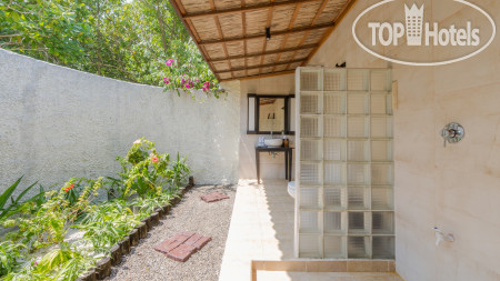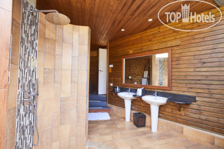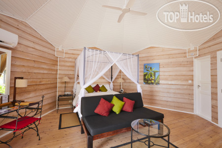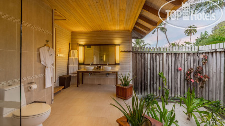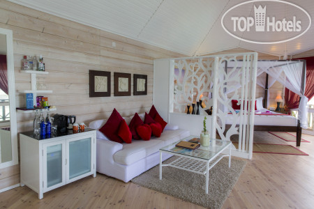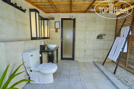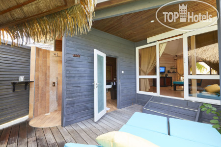 Что за деньги: весь крепкий алкоголь в номере, шампанское в винном баре (3 бут.), энергетики, кофе больше чем 2 капсулы в день. Вообще, вилла сделана интересно: из основного круглого помещения есть выход во внутренний дворик, в котором располагаются туалет, 2 раковины с зеркалами, душевая кабинка, джакуззи и лежаночка, чтобы просто отдохнуть около джакуззи. В этом дворике что-то под крышей, что-то под открытым небом. Есть натянутая бельевая веревка с прищепками. Со стороны главного входа в виллу есть терасса со столиком и двумя креслами. Также есть вынесенные на песочек по пути к воде 2 лежака и столик.